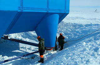 All the new Modules are fitted with Hydrolic legs and have skis attached. This is so they can be raised to stay on the surface and pulled other locations so as not to get snowed in and buried like Halley V.... Here the legs are being anchored together to stop everything from twisting during the move.